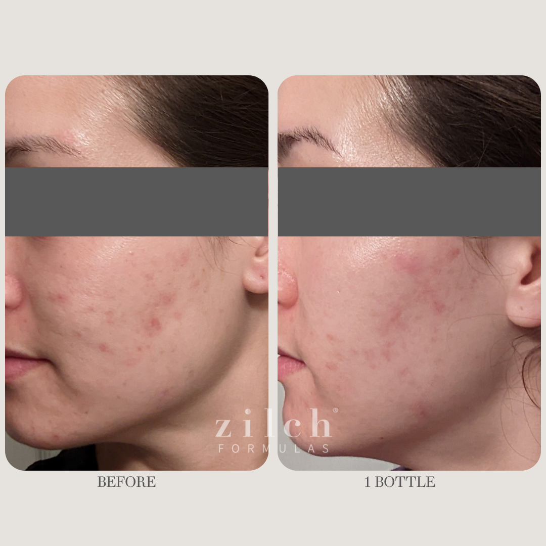 "I recently began struggling with c***ic acne this year, which quickly got worse. It began on my cheek and spread to my jawline. Every day I had new breakouts and I struggled wit...h getting to the root cause. The acne began affecting my mood and I would obsessively take photos of my face to see if it was improving. I quit dairy which helped a bit but not entirely. I have been taking the Zilch Acne Formula for 3 weeks (4 pills a day) and have seen big improvements. My skin produces less oil, my jaw line is almost clear and my cheeks have been clearing up slowly as well. I just increased the dosage from 4 pills to 6 pills yesterday. I believe my acne is hormonal and I may have PCOS . I will be trying the other Zilch products in combination with each other to continue my acne healing journey.